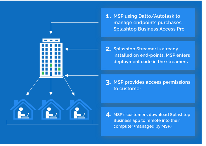 MSP 希望客户能够居家高效办公。通过 Splashtop,即可帮助客户远程访问个人计算机,无需安装任何其他软件。可以利用已与 Datto RMM 集成安装的 Streamer,帮助客户从本地设备远程访问个人计算机。