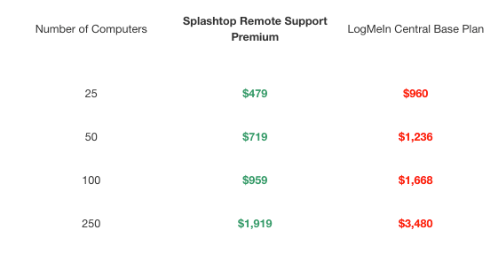 与LogMeIn Central一样,Splashtop 远程支持是根据你需要访问的计算机数量来定价的。 Splashtop 请看下表,如果你想获得与LogMeIn Central基本计划中相同的顶级功能,你的价格会是多少?