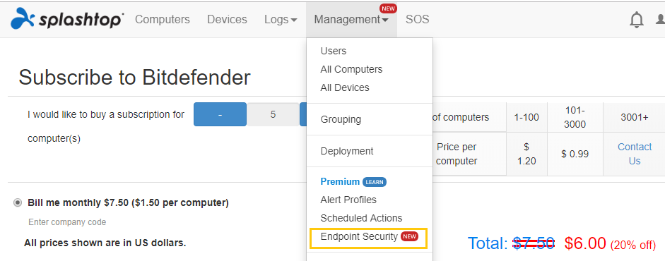 通过在 my.splashtop.com 控制台内购买和部署 Bitdefender 端点安全来保护您的计算机。此功能在Splashtop Remote Support中可用,包括无人值守的计算机访问。 根据您的 Splashtop 计划,访问管理 | 端点安全或管理 | 防病毒下的此新类别。点击此处了解更多