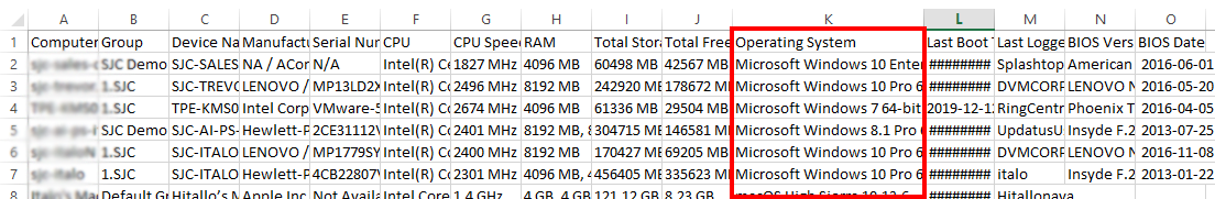 下载 "系统/硬件清单 "会给你一个CSV文件,可以在Excel中打开。 正如你在下面看到的,这个文件逐行列出了每个被管理的设备,"操作系统 "是工作表中的一个列。