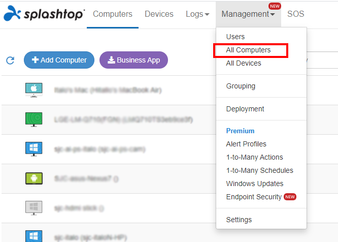 在 "所有计算机 "页面,你会看到你所有被管理的设备的列表。 这些是安装了你的Splashtop Streamer的所有设备。