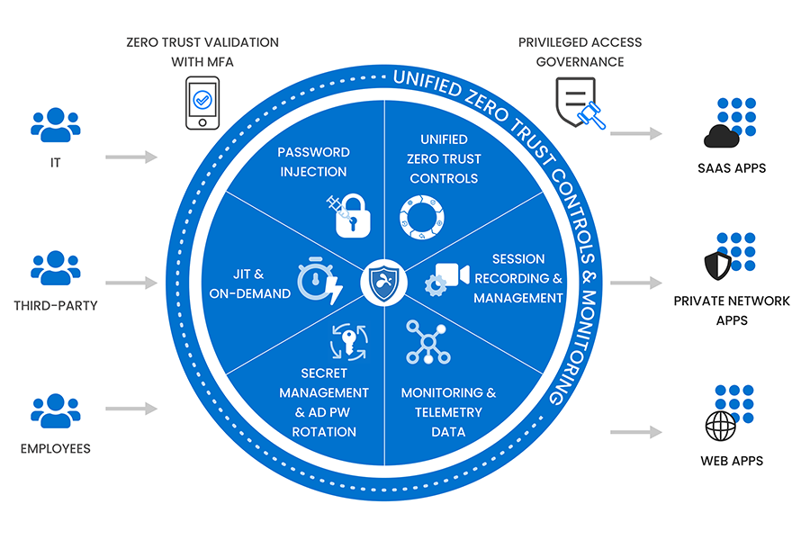 特权账户安全:通过无缝凭证注入、隐藏密码、实时监控和会话录制功能保护特权账户的安全。