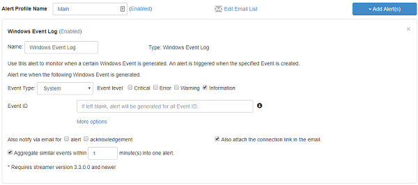 通过设置警报监控Windows 事件日志。 当一个事件日志的标准与管理员设置的触发器相匹配时,就会产生警报。